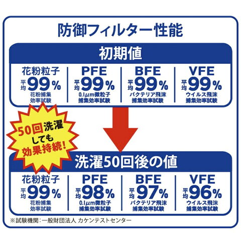 【5層の防御フィルター 】 5層の防御フィルターで「花粉・ウィルス飛沫・PM2.5をカット」 50回洗濯しても効果が持続します。