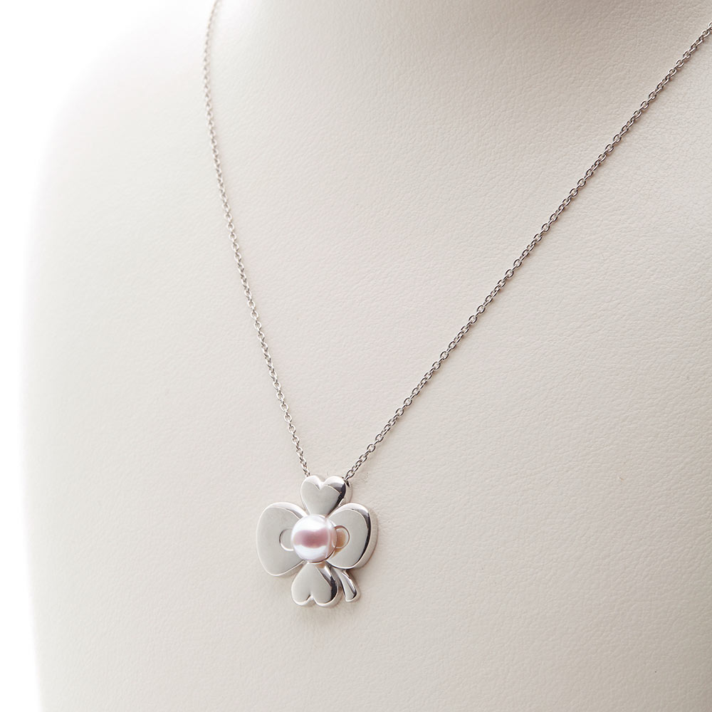 Size パールのサイズ:7.0mm長さ:51cm(46cm+アジャスター5cm) トップのサイズ(縦20mm×横19mm×幅8mm) ハローキティのアイコンともいえるリボンと幸福のシンボルである四つ葉のクローバーをかけあわせた、最高のコラボレーションのペンダントです。